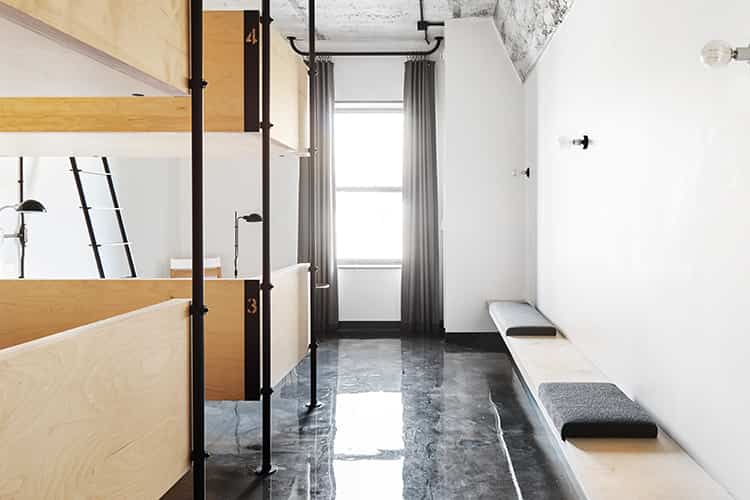 El lobby está concebido como una plataforma programable que puede acoger puestos de venta, conciertos y otras actividades. El edificio original es un antiguo almacén a prueba de fuego: un testimonio de Chicago arenoso pasado industrial. Preservar y exponer la estructura existente y arácter, los arquitectos DELORDINAIRE celebran la naturaleza utilitaria del edificio. Los materiales y accesorios continúan el concepto de diseño; se deja el conducto con luces expuestas y de neón marcan los pasillos. El vestíbulo termina combinando paneles de hormigón y madera contrachapada de abedul. En los dormitorios, el hormigón existente.
