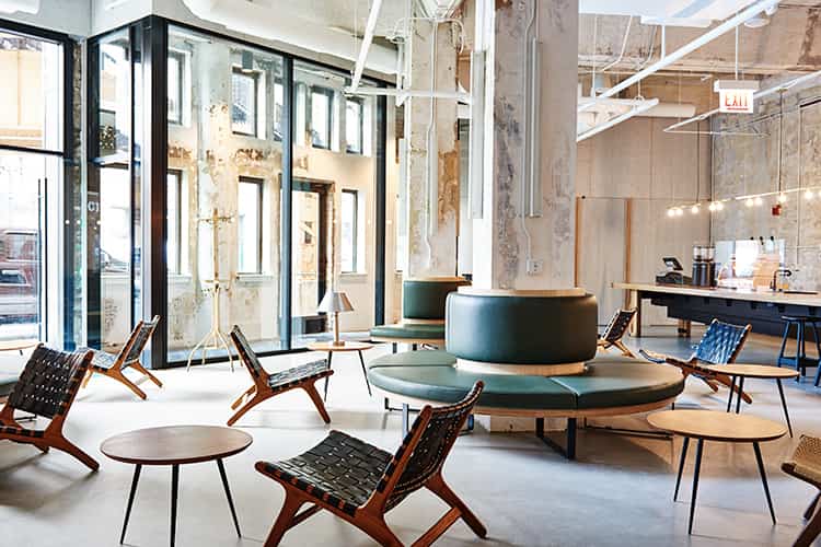El diseño alienta a los lugareños e invitados a cruzar caminos e interactuar en un contexto relajado. El espacio ofrece un centro atípico de actividad, con poco a ninguna separación entre la diversa combinación de servicios disponibles. Una cafetería y el área de coworking se sienta lado a lado en un banco de trabajo de madera de 27 pies de largo. El área de invitados de yuxtapone con grandes banquetas de cuero y sillones.