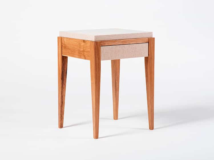 Mesa de luz con cajón. Estructura de Petiribí macizo. Tapa mesa y tapa cajón de mdf revestido en distintas terminaciones, en distintos colores. Medidas standard: ancho 0,40 m profund 0,35 m altura 0,56 m Se puede hacer en otras medidas.