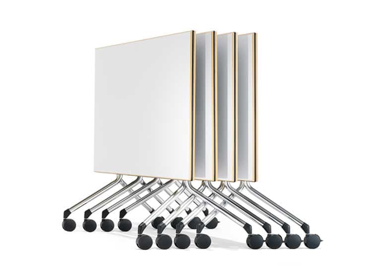 Diseño de Kusch+Co. (Alemania) Su mecanismo es muy sencillo, pudiendo posicionarse rápidamente tanto en la posición horizontal de trabajo, como en la posición vertical para su almacenamiento. Dado que la base tiene ruedas, su traslado para almacenamiento en espacios reducidos es muy fácil y práctico.