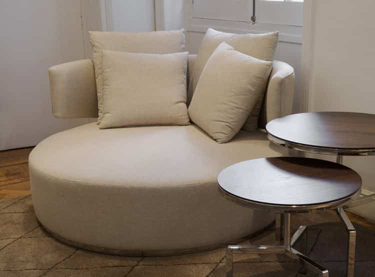 Sillón de 1.30 mts de diámetro con tela lino cemento. El sillón es giratorio y es ideal para ambientes de relax, para ver alguna película o leer un libro. Se puede hacer a medida y la tela es a elección.